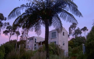 Take a right up Petersons Hill Road which quickly turns left then right again up the hill. Take a wee breather and enjoy the view across the bay . Continue up Petersen’s Hill Road and at the first fork turn right. Hove-to will be towering above you on your left. The main drive is on the right hand side of the property as you will be looking at it, or take the bush track stairs.
